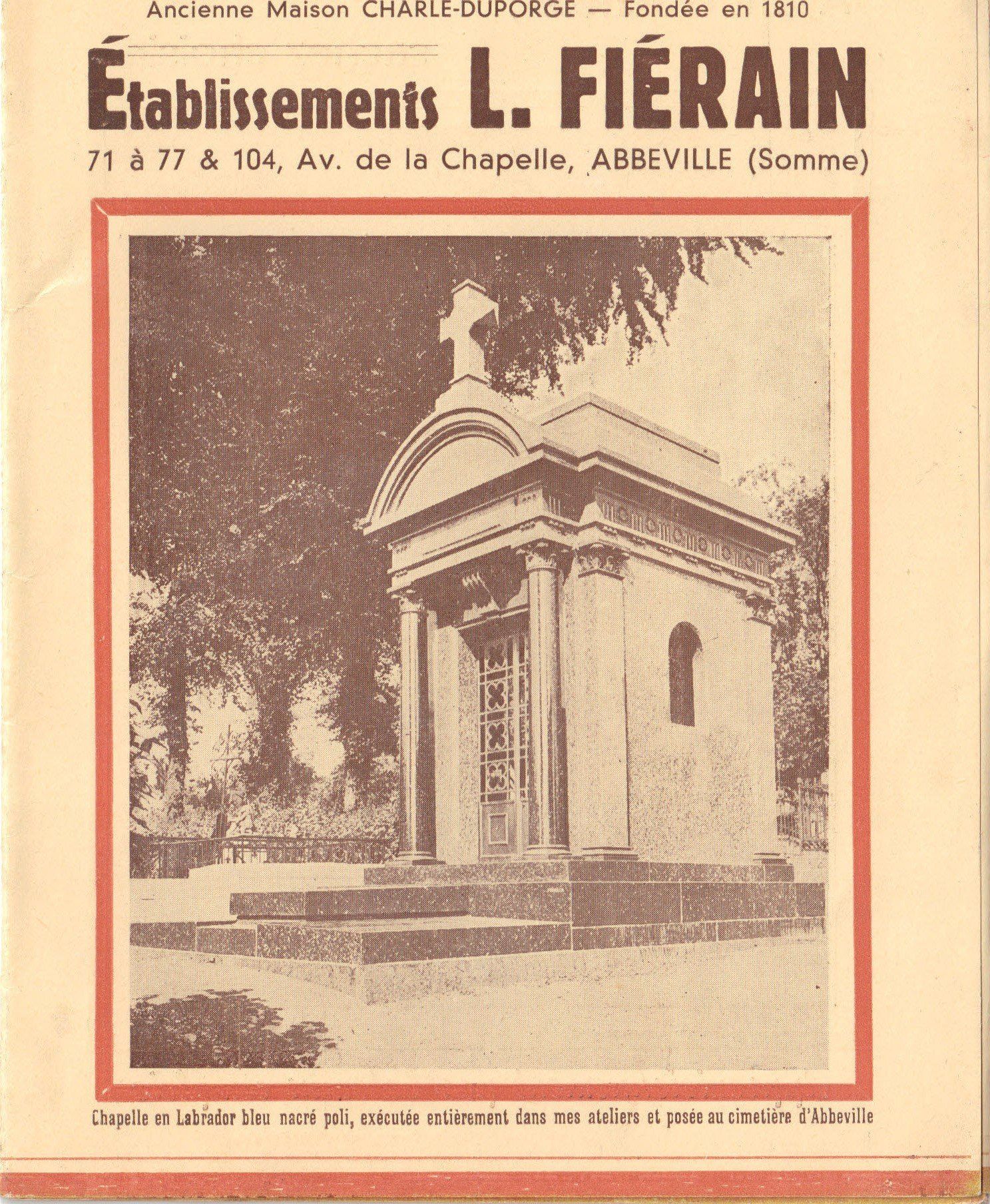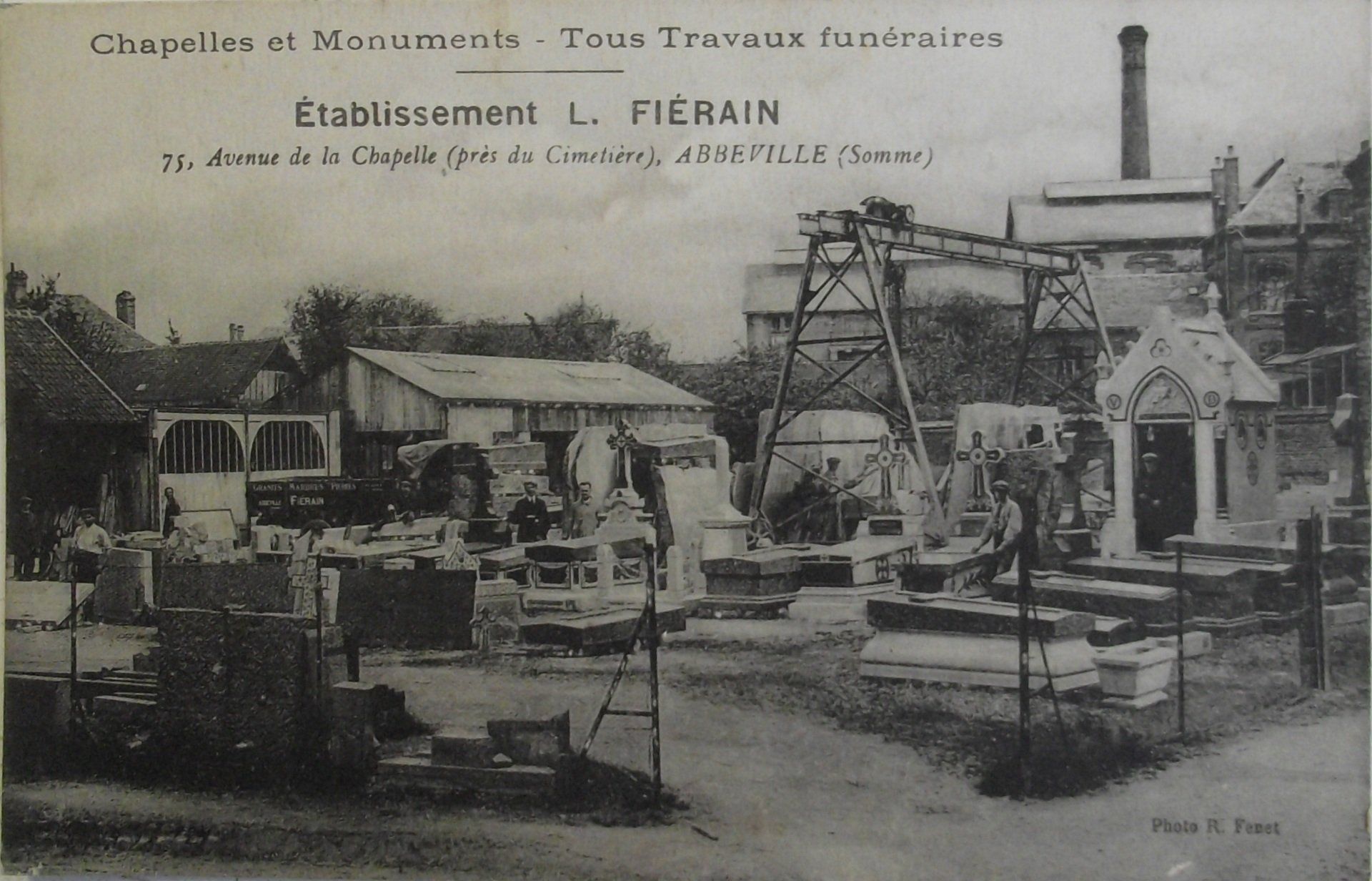 La société a été créée en 1899 par Léopold FIERAIN et s’implante sur le Boulevard de la République à Abbeville. Léopold FIERAIN était le correspondant d’une carrière de pierre en Belgique où il exécutait lui-même des travaux de sculpture, gravure sur pierre et sur marbre.